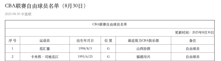 CBA官方更新自由球员名单:新增范汇鎏和卡米然两人